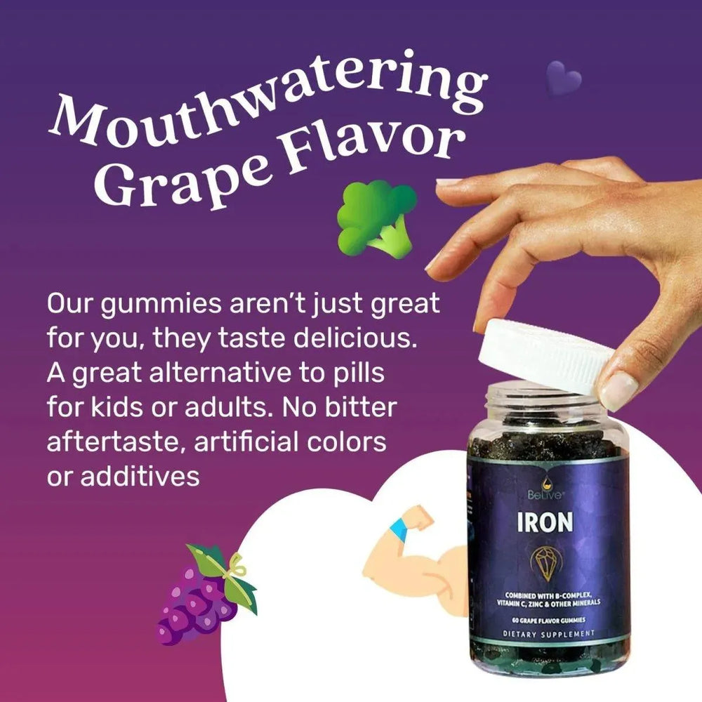 • Suplementos de gomitas masticables: nuestras gomitas de hierro BeLive para niños y adultos pueden ayudar con un embarazo saludable, un mejor rendimiento atlético y energía. Las gomitas BeLive elaboradas con sabor a uva natural son la manera fácil de tomar una dosis diaria de hierro.