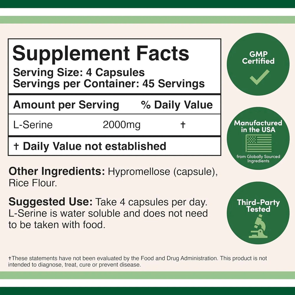 • La friolera de 2000 mg de tamaño de porción; Doublewood proporciona 180 cápsulas (45 días de la porción de 2000 mg utilizada en estudios recientes que demuestran que la L Serina apoya la salud cerebral y la función cognitiva).