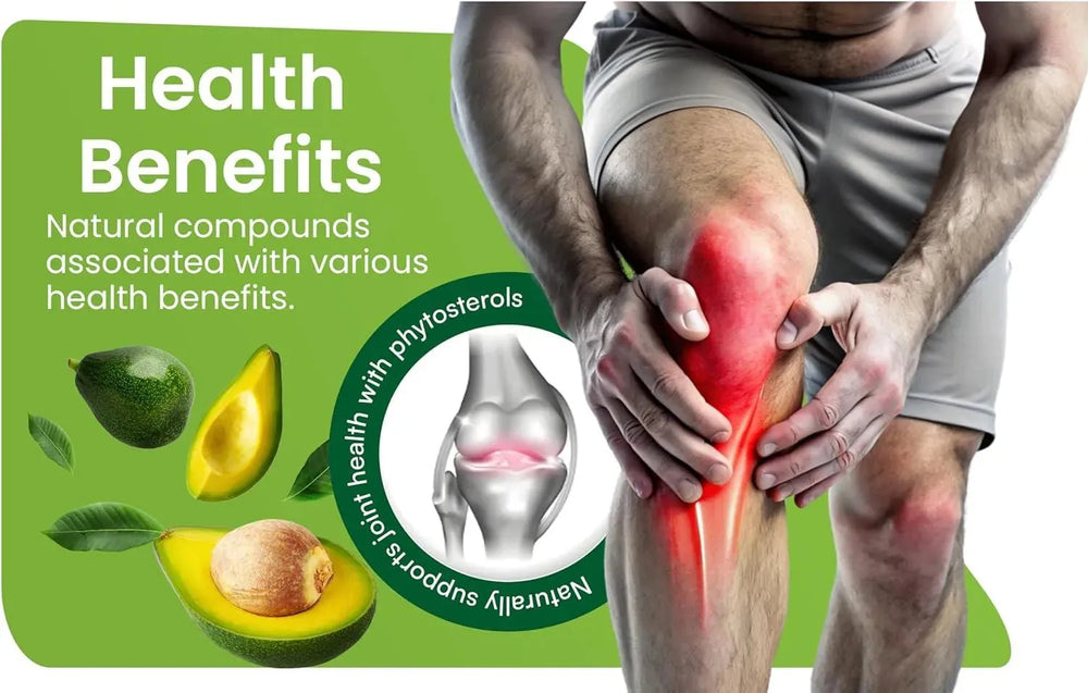 Salud de las articulaciones: la fruta Persea Americana, reconocida como aguacate, es un compuesto natural derivado de plantas, ampliamente utilizado en Europa desde la década de 1990 para promover un suplemento para la salud general de las articulaciones. Más allá de sus propiedades de apoyo a las articulaciones, el aguacate es rico en fitoesteroles, potasio, vitamina A, C, D, E, B1 (tiamina), B2 (riboflavina), B6, B12, niacina, hierro, lodo, cobre, magnesio y zinc. ! Todos los compuestos naturales asociados con diversos beneficios para la salud.