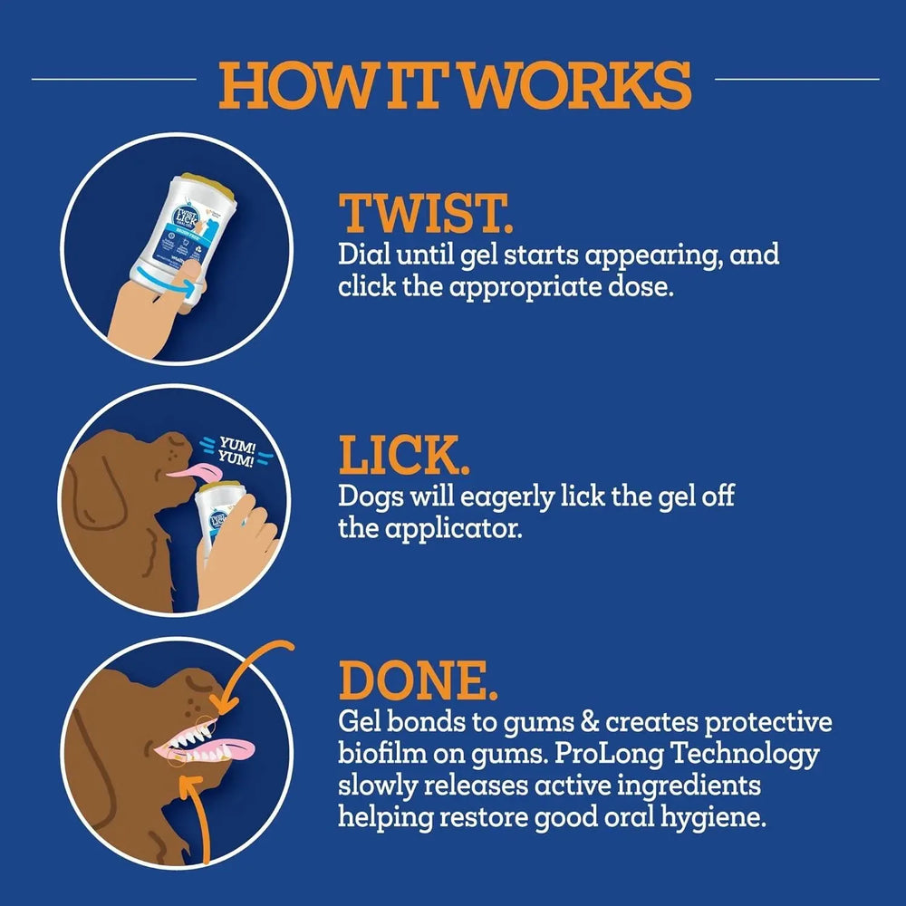 FÁCIL Y DIVERTIDO - 100% sin cepillo: simplemente gírelo hasta la cantidad deseada y deje que su perro lama el sabroso gel, como si fuera una golosina (¡sin calorías!). El movimiento normal de lamido de su perro ayuda a depositar el gel en su boca, sin necesidad de cepillo de dientes.