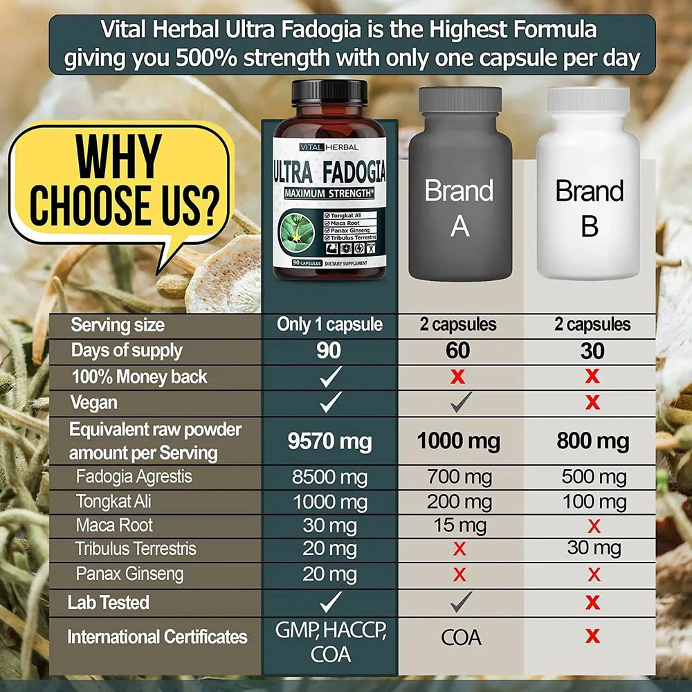FÓRMULA ESPECIAL - UNA CÁPSULA POR DÍA: Una cápsula de extracto de Ultra Fadogia equivale a 9570 mg de polvo crudo. Esa es una de las fórmulas más altas de Fadogia Agrestis. Por lo tanto, solo una cápsula al día puede brindarle una mayor potencia que 2 o 3 cápsulas de otros suplementos de Fadogia Agrestis.